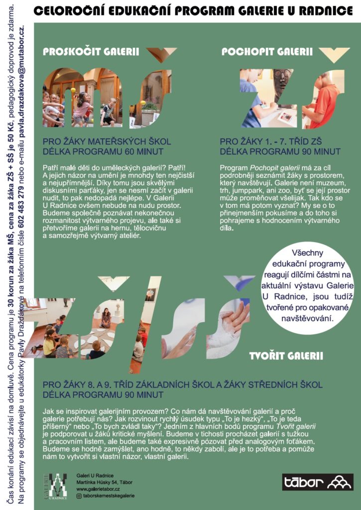 V táborských městských galeriích dlouhodobě nebyl program, který by seznamoval žáky zejména se současným výtvarným uměním. Proto naše nová edukátorka Pavla Dražďáková vytvořila třístupňový edukační program, na který se mohou školy hlásit v průběhu celého roku. Program je vytvořen jak pro mateřské a základní školy, tak i pro střední školy, které dosud neměly možnost pravidelných edukací. Jednotlivě se programy nazývají Proskočit galerii (MŠ), Pochopit galerii (1. -7. třída ZŠ), Tvořit galerii (8. – 9. třída ZŠ, SŠ). Tyto edukace primárně pracují s výstavami Galerie U Radnice, kde se jejich převážná část koná. Vzhledem k tomu, že dílčí části a výtvarné aktivity reflektují aktuální výstavu, je možné tyto programy navštěvovat opakovaně vždy s novou výstavou.