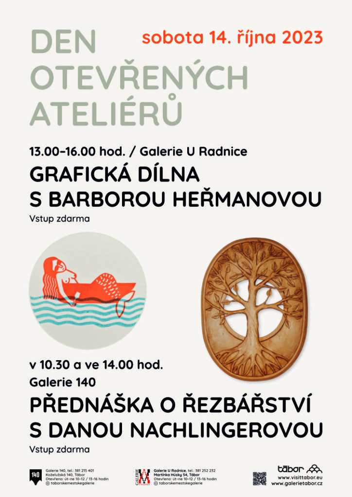 V sobotu 14. října zveme na Den otevřených ateliérů! V 10:30 a ve 14:00 přednáška o řezbářství s Danou Nachlingerovou. V mezičase bude Dana Nachlingerová návštěvníkům odpovídat na dotazy, podle zájmu bude možnost i komentované prohlídky výstavy. Po celý den vstup zdarma.