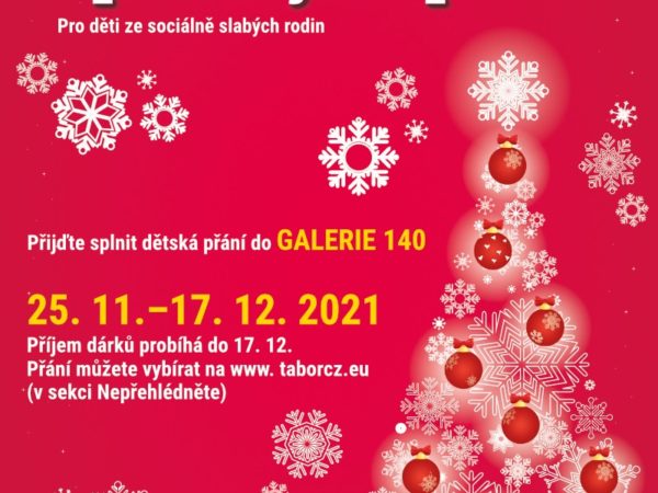 Součástí výstavy je i letos Vánoční strom splněných přání (24. 11. – 17. 12. 2021) pro děti ze sociálně slabých rodin. Více informací získáte v Galerii 140 na telefonu 602 246 818 a na e-mailu: marketa.brynychova@mutabor.cz. Seznam přání naleznete i na www.taborcz.eu v sekci NEPŘEHLÉDNĚTE. V současnosti jsou všechna přání rezervována. Děkujeme mnohokrát!