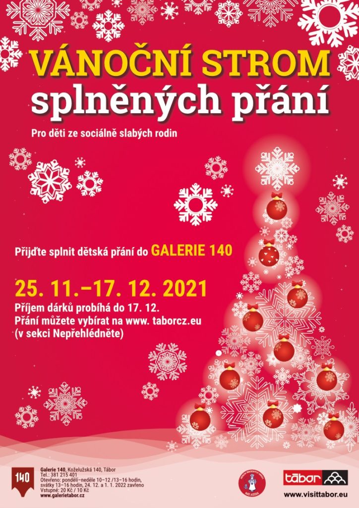 Součástí výstavy je i letos Vánoční strom splněných přání (24. 11. – 17. 12. 2021) pro děti ze sociálně slabých rodin. Více informací získáte v Galerii 140 na telefonu 602 246 818 a na e-mailu: marketa.brynychova@mutabor.cz. Seznam přání naleznete i na www.taborcz.eu v sekci NEPŘEHLÉDNĚTE. V současnosti jsou všechna přání rezervována. Děkujeme mnohokrát!